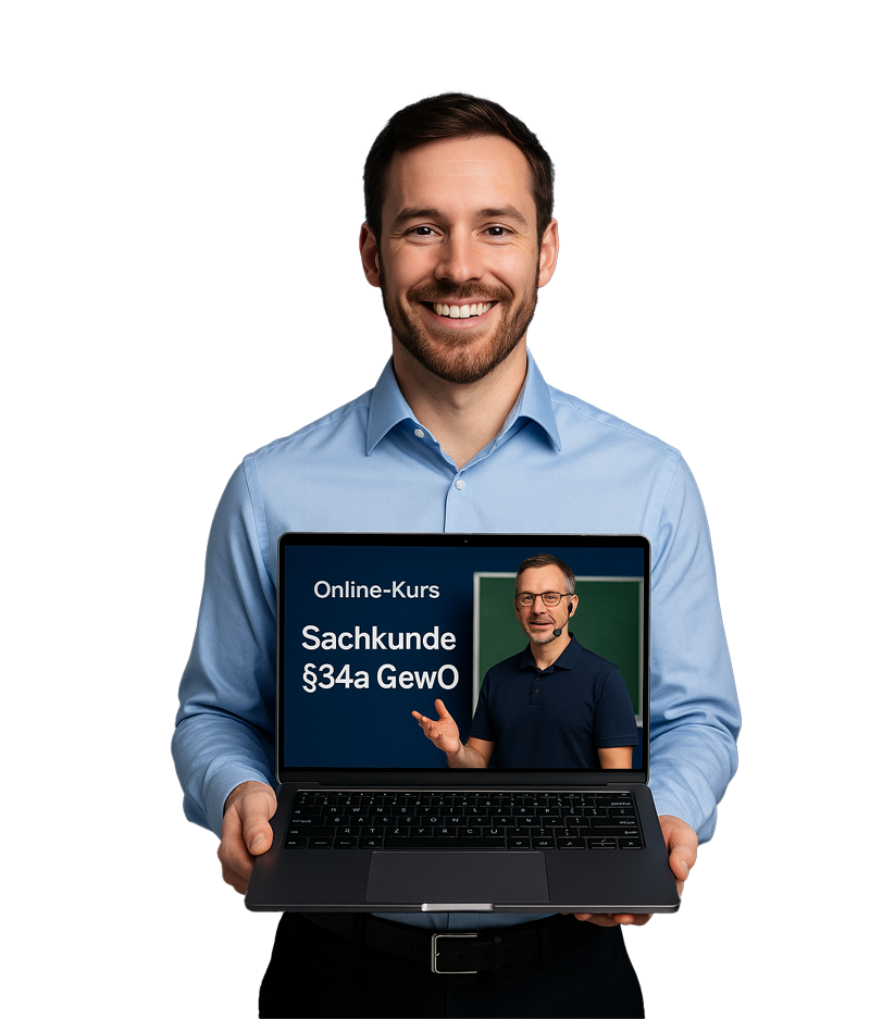 Mach deine §34a-Sachkunde ganz bequem von zu Hause. Du lernst online, live mit unseren Trainern oder per Aufzeichnung, wann es dir passt. Unsere Profis erklären alles verständlich, Schritt für Schritt. So bist du top vorbereitet auf die IHK-Prüfung. Ganz ohne Stress und mit direkter Unterstützung.